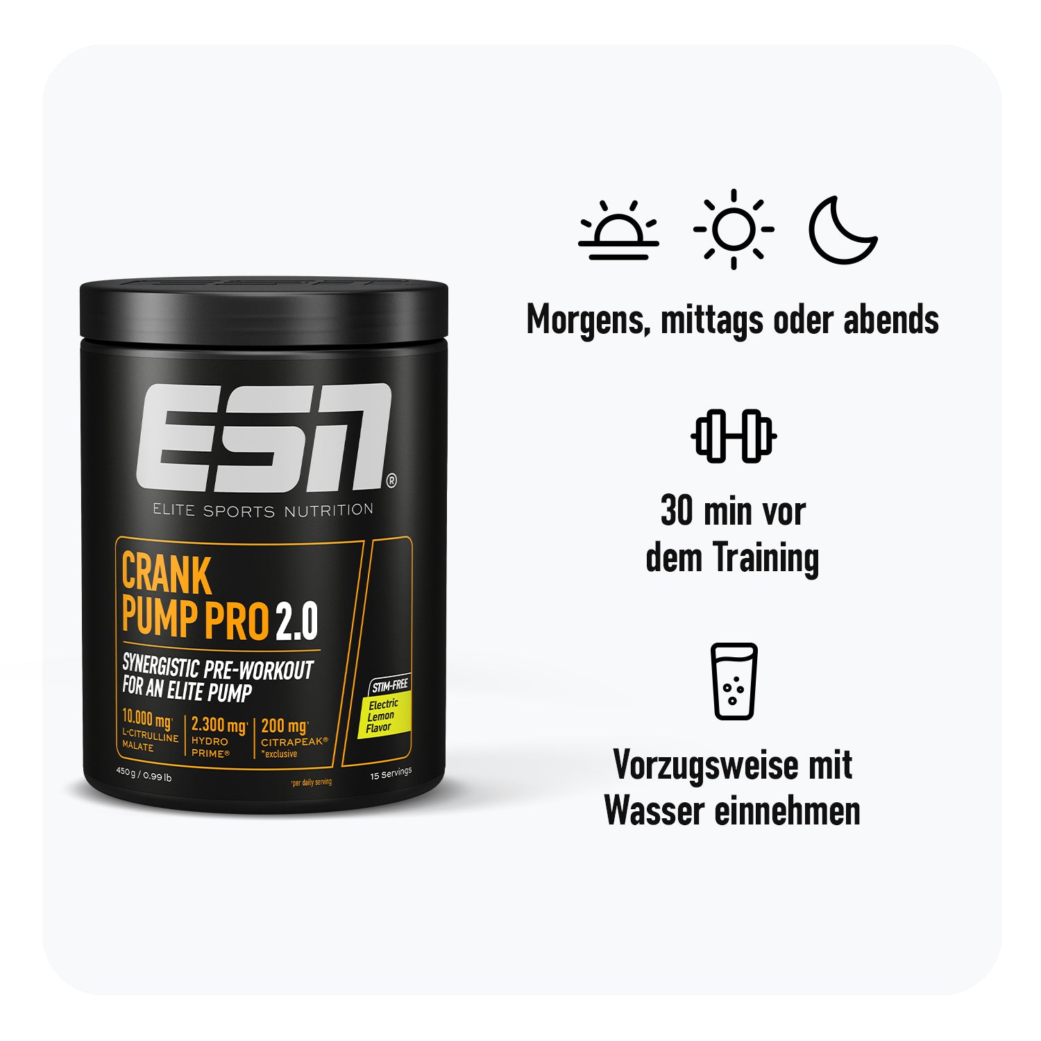 Crank Pump Pro 2.0 ist keine Weiterentwicklung – es ist eine komplette Neudefinition, die den Standard der Pump Technology revolutioniert: Der 1. Booster in Europa mit dem exklusiven, innovativen Pump-Wirkstoff CitraPeak®, der dir einen Pump liefert, den du so noch nie erlebt hast. Kombiniert mit weiteren hochdosierten Pump-Wirkstoffen sowie ergänzt durch Aminosäuren, Elektrolyte und Vitamine sorgt unser Next-Generation-Pump-Booster für das heftigste Trainingserlebnis aller Zeiten – ohne Stimulanzien, ohne Crash, perfekt für jede Trainingszeit.1 Du willst Volumen spüren, bevor du das Gewicht berührst? Dann ist das hier dein Scoop.
