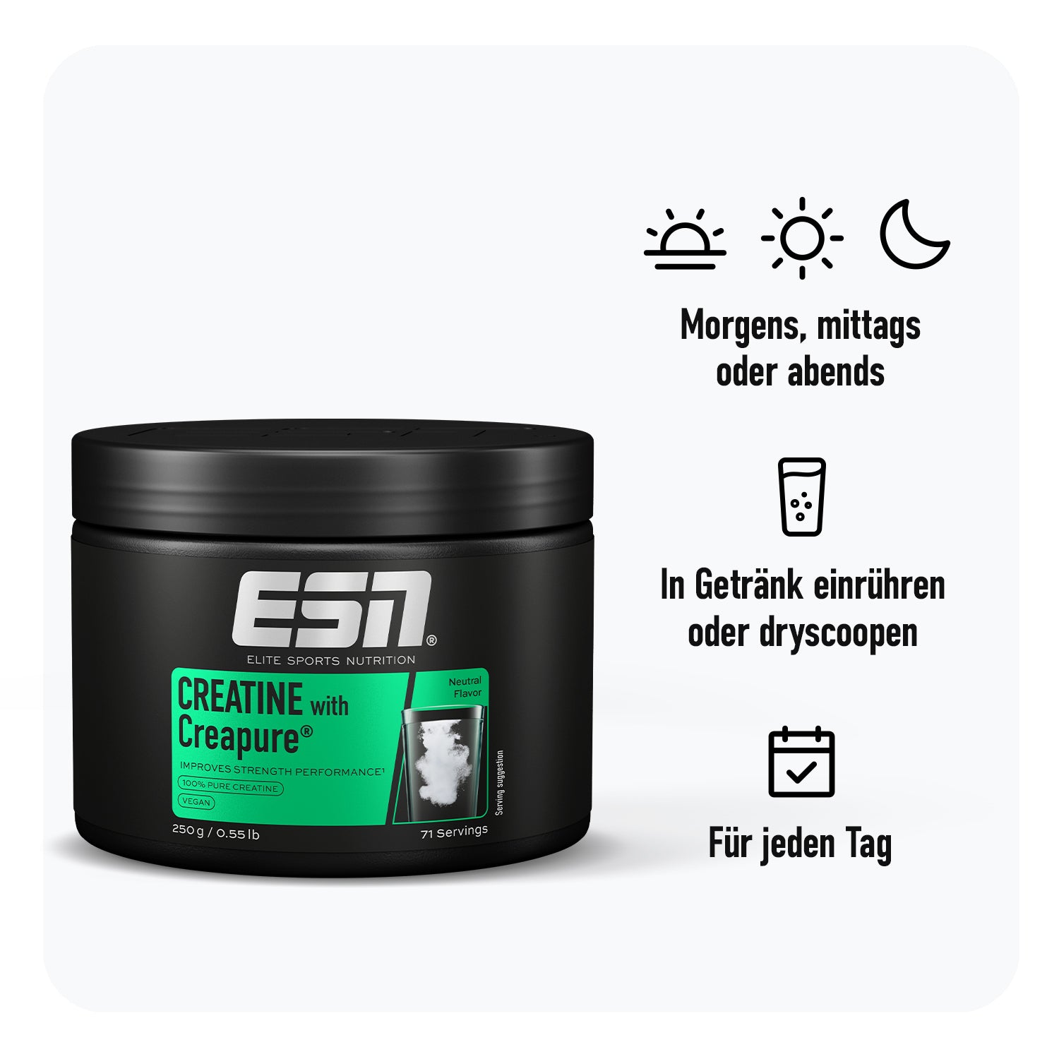 Power up with creatine – mit Creapure®. Das patentierte Kreatin-Monohydrat ist unser Must-have für alle Athletes, die ihre Leistung optimieren wollen: Denn Kreatin erhöht nachweislich deine körperliche Leistung.1 Der ideale Support für dein Training – und auch deinen Alltag.