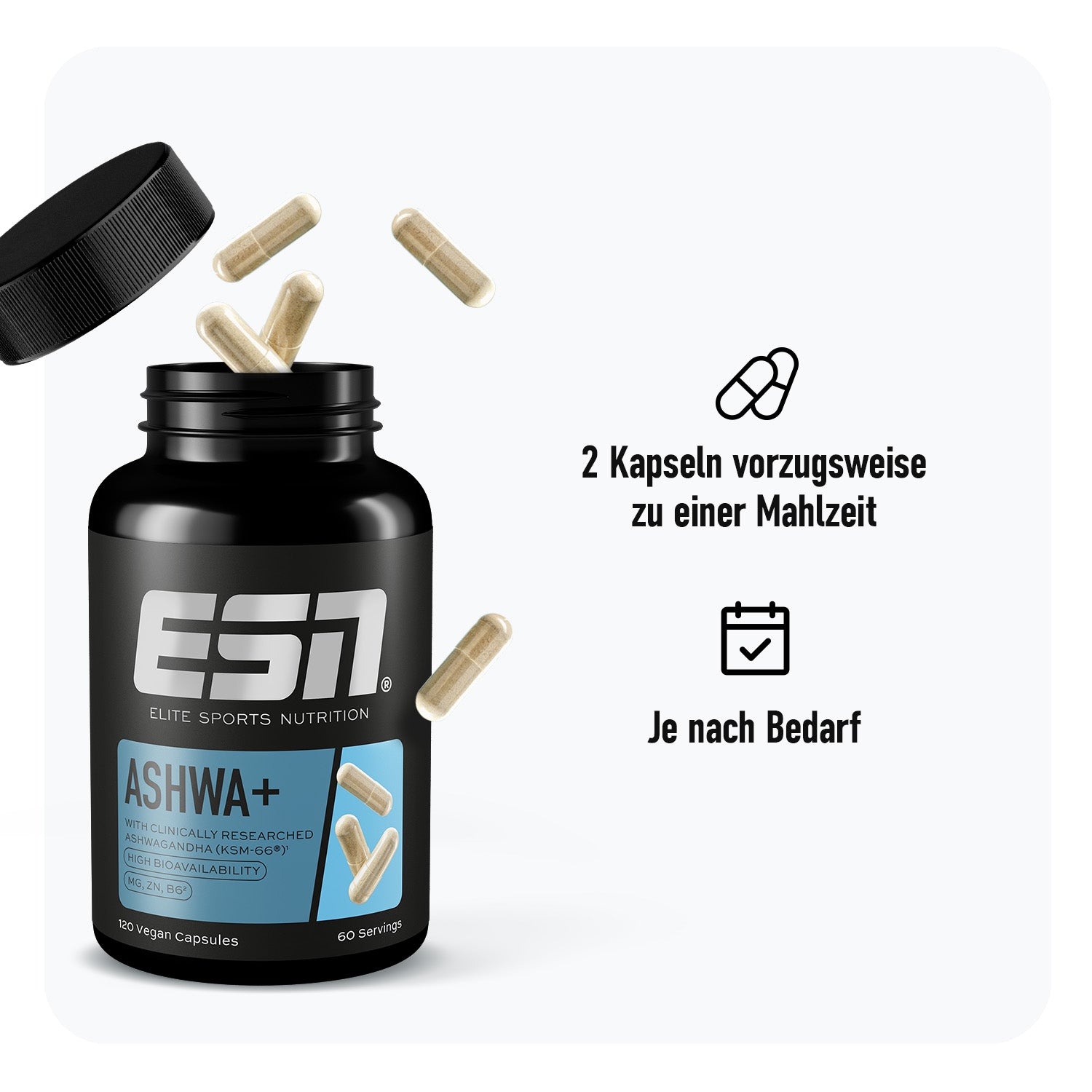 Antioxidative stress control – mit unserem Ashwa+. Wir haben patentiertes Ashwagandha (KSM-66®) mit Anti-Stress-Nährstoffen für mentale Balance und Zellschutz kombiniert.1,2,3 Der ideale Support, den du bei harten Workouts oder einem stressigen Alltag brauchst.