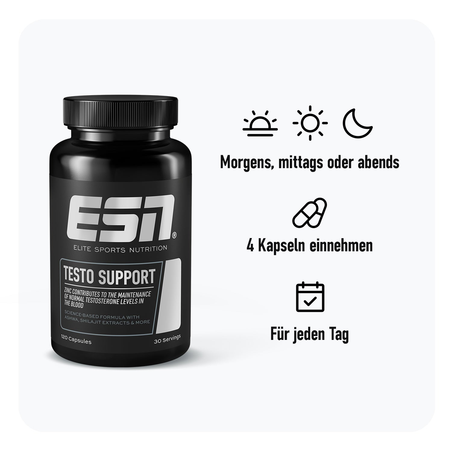 Science meets nature: Unser Testo Support kombiniert Zink, das nachweislich zum Erhalt eines normalen Testosteronspiegels beiträgt, mit weiteren Mikronährstoffen und ausgewählten Pflanzenextrakten – für deinen täglichen Nährstoff-Support in intensiven Phasen. 1 Ideal für Männer, die jeden Tag ihr Bestes geben – im Training, Job oder Alltag.
