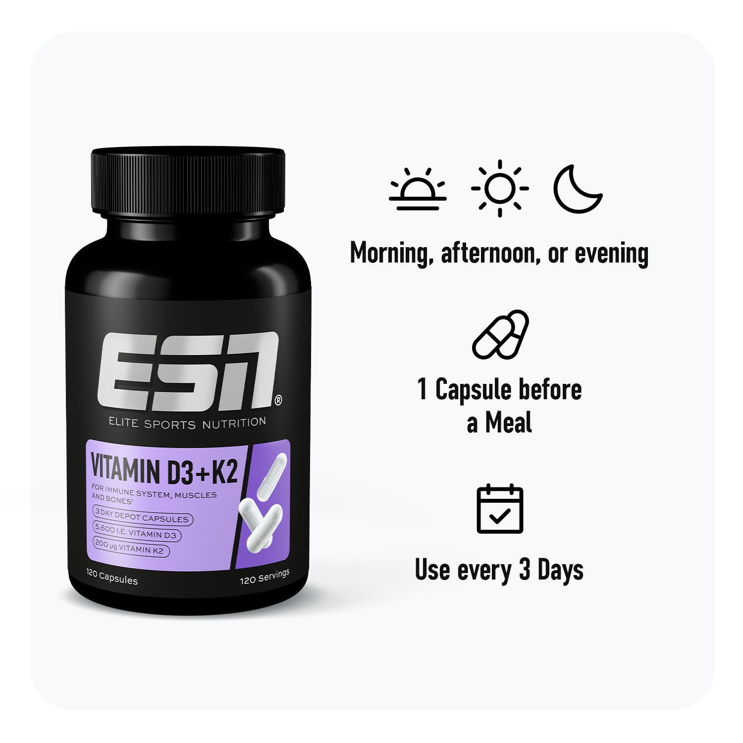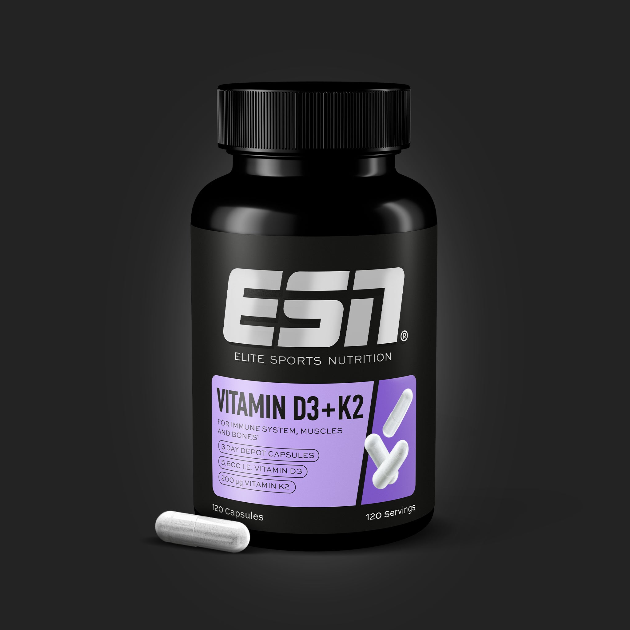Vitamin power duo: Vitamin D3+K2 Capsules. The combination of vitamins D3 and K2 effectively supports your bones, muscles, immune system and blood clotting.¹'² The ideal support for your performance base with just one capsule every three days.