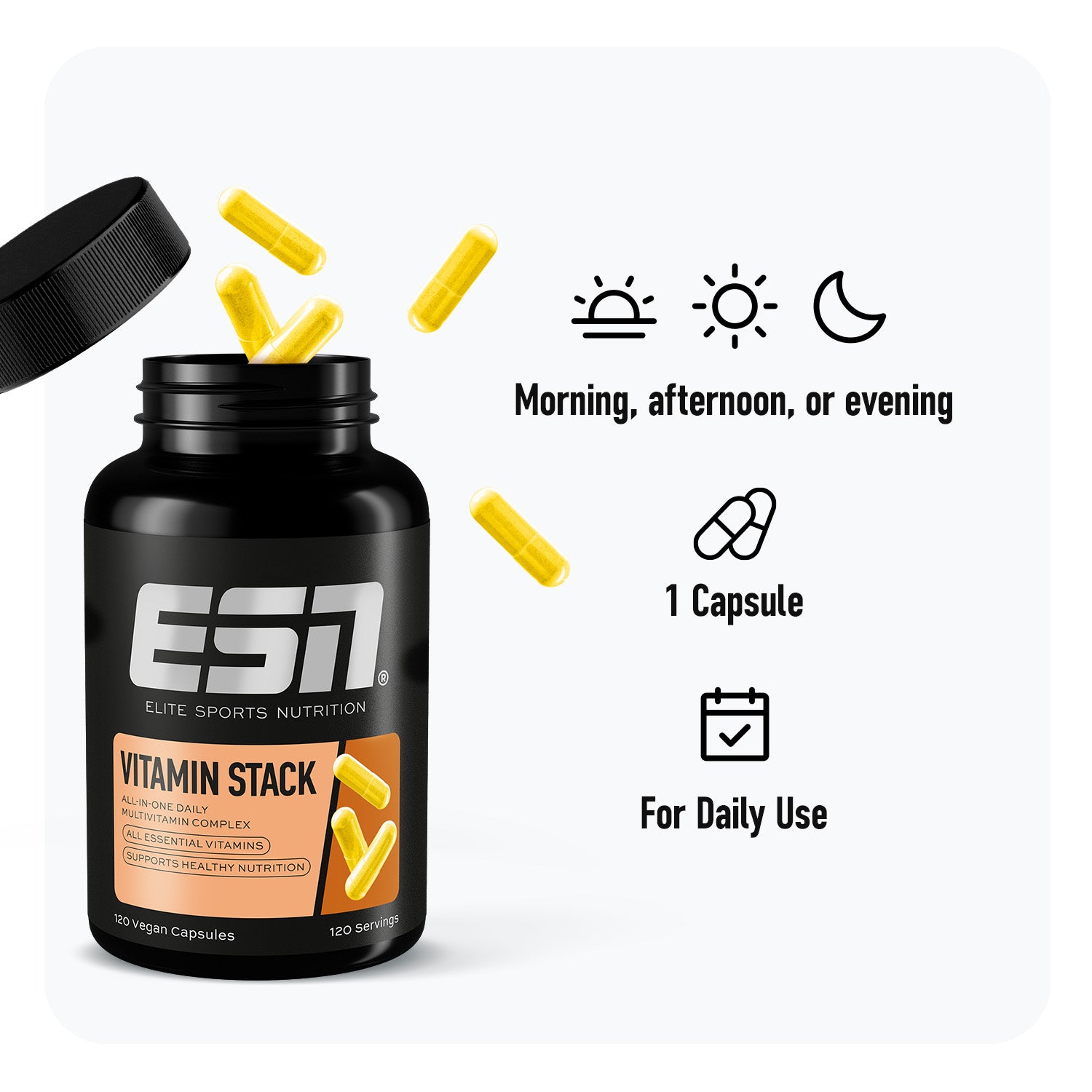 Vitamins Mixture [Vitamin C (L-Ascorbic Acid), Anti-Caking Agent (Microcrystalline Cellulose), Niacin (Nicotinamide), Vitamin E (DL-alpha tocopherylacetate), Pantothenic Acid (Calcium-D-Pantothenate), Biotin (D-Biotin), Vitamin A(Retinyl Acetate), Vitamin D3 (D3/Cholecalciferol), Vitamin B12 (Hydroxocobalamin),Vitamin B6 (Pyridoxine Hydrochloride), Riboflavin (Vitamin B2), Thiamin (ThiaminMononitrate), Vitamin K1 (K1/Phytomenadione), Folic Acid (Pteroyl MonoglutamicAcid)], Capsule Shell (Glazing Agent (Hydroxypopyl Methyl Cellulose))Vitamin Stack Key Facts