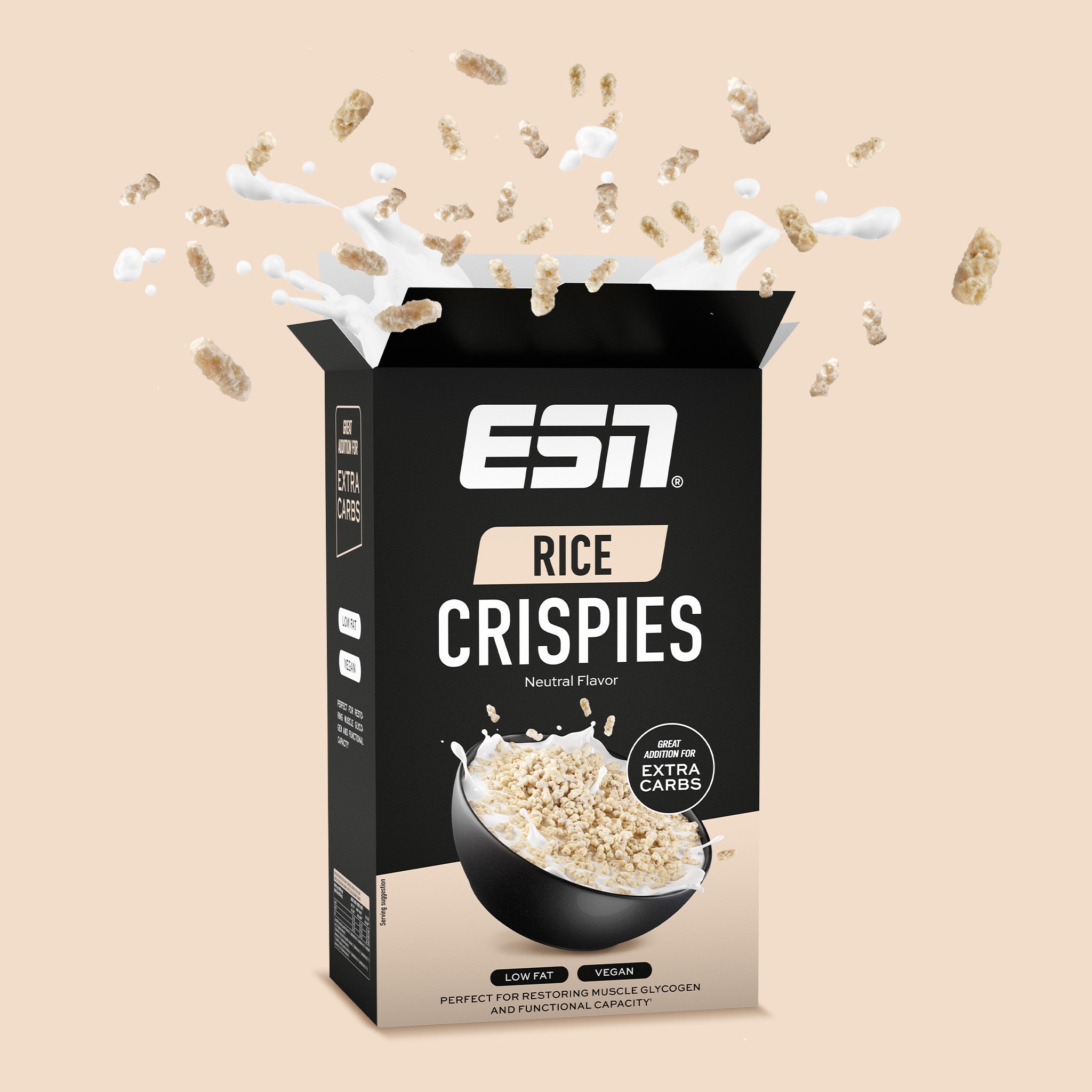 Rice Crispies are not just a fantastic energy source; they're also super versatile and irresistibly crispy. Enjoy them in Neutral or Chocolate flavour and snack on them straight from the box, mix them with (plant-based) milk for a breakfast treat, or boost your protein shakes with some extra carbs. They're also great as a crunchy topping for your yogurt, porridge, and so much more – the sky's the limit.