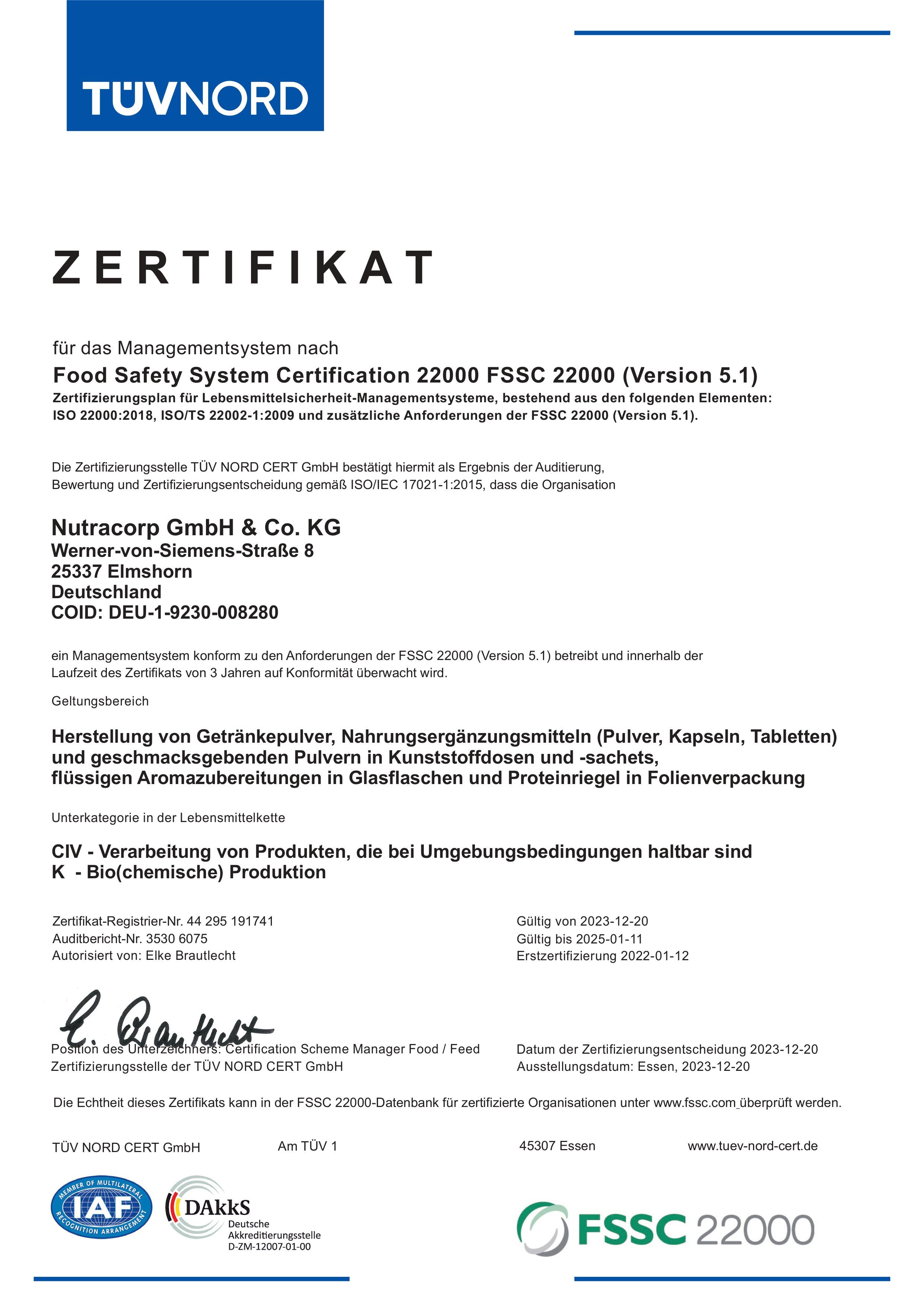 Nuestra certificación FSSC 22000, aprobada por TÜV, es un claro compromiso con los más altos niveles de seguridad alimentaria y gestión de calidad. Combina las normas ISO 22000 con amplias medidas de seguridad y demuestra nuestro compromiso con una calidad de primera clase en la producción. La auditoría independiente de TÜV confirma que nuestros procesos de producción y normas de higiene cumplen los requisitos internacionales más exigentes.