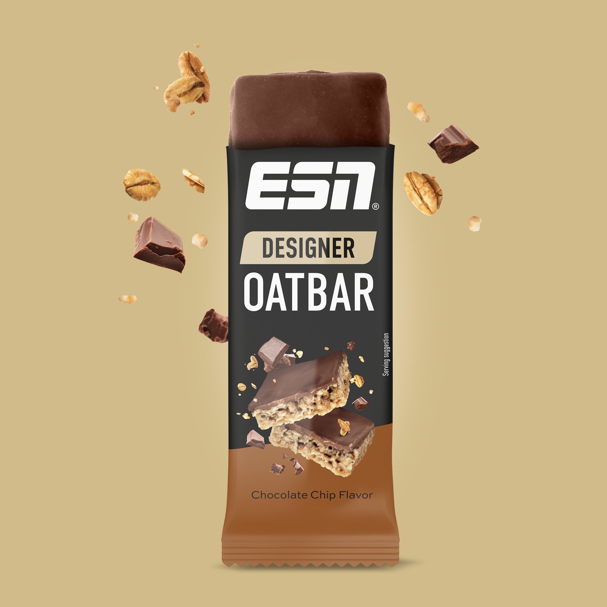 Avena 34 %, cobertura sabor chocolate negro 17 % (edulcorante (maltitol), grasas vegetales (palma, palmiste, karité), cacao en polvo (altamente desgrasado), emulgente (lecitinas (girasol))), jarabe de caña de azúcar, aceites vegetales (palma, colza), chips de chocolate 8 % (pasta de cacao, azúcar, manteca de cacao, cacao en polvo (altamente desgrasado), emulgente (lecitinas (soja))), azúcar, harina de soja, humectante (glicerina).Designer Oatbar Key-Facts