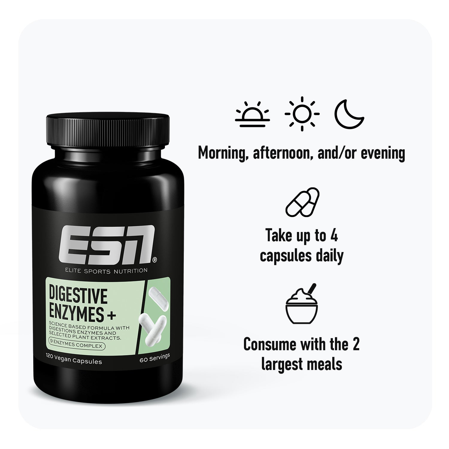Haga que cada bocado cuente - con nuestras Enzimas Digestivas+. El complejo de 9 enzimas, extractos de plantas seleccionadas y otros ingredientes ayuda eficazmente al organismo a descomponer los alimentos en sus componentes básicos, que el cuerpo puede utilizar de forma eficiente. Ideal para aprovechar al máximo sus comidas.1,2,3