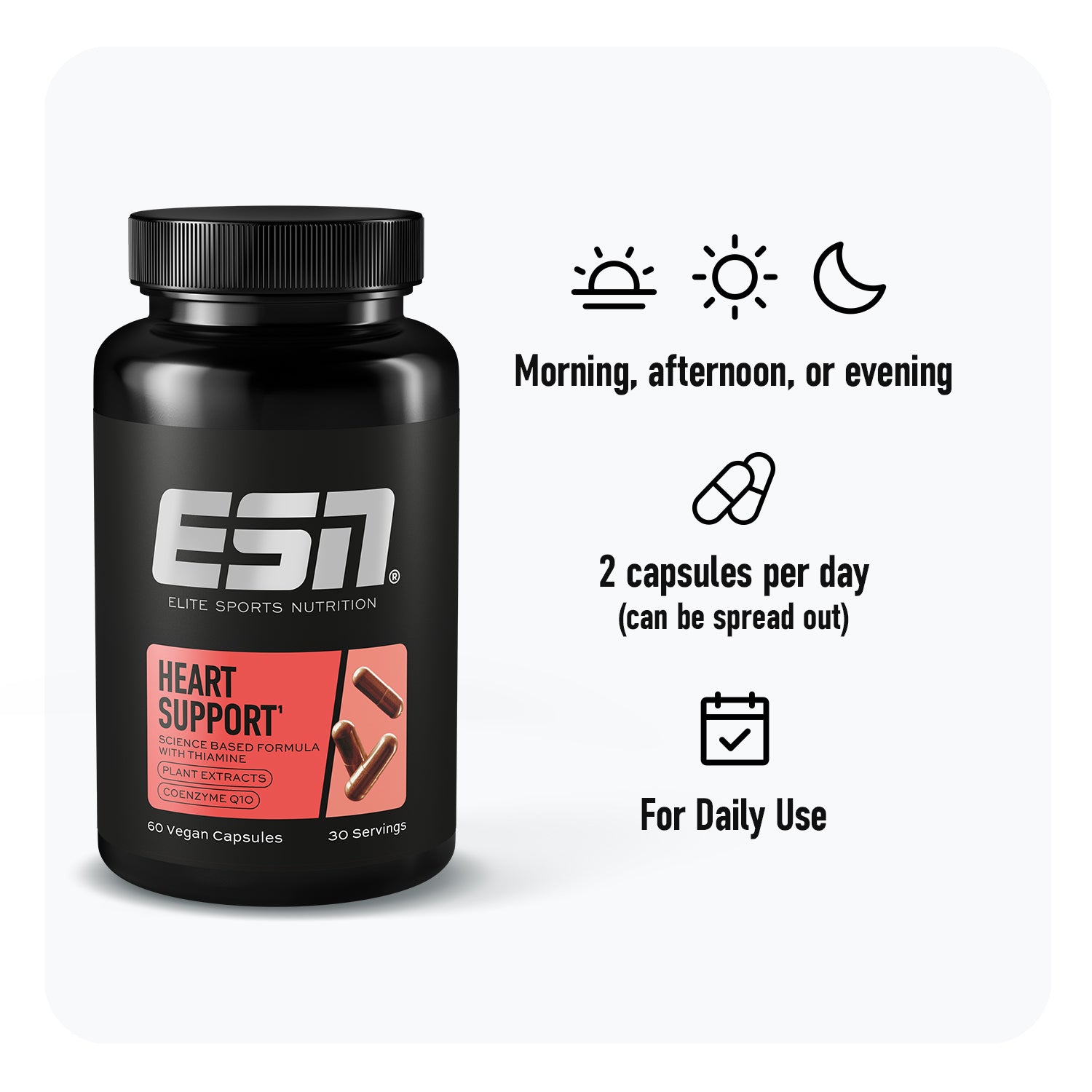 Extracto de remolacha, extracto de naranja amarga,extracto de granada, cubierta de la cápsula (hidroxipropilmetilcelulosa), extracto de gotu kola, extracto de soja fermentada, coenzima Q10,antiaglomerantes (sales magnésicas de ácidos grasos, dióxido de silicio), tiamina (clorhydrato de tiamina), vitamina B6 (piridoxal-5'-fosfato), L-selenometionina.Heart Support, en breve