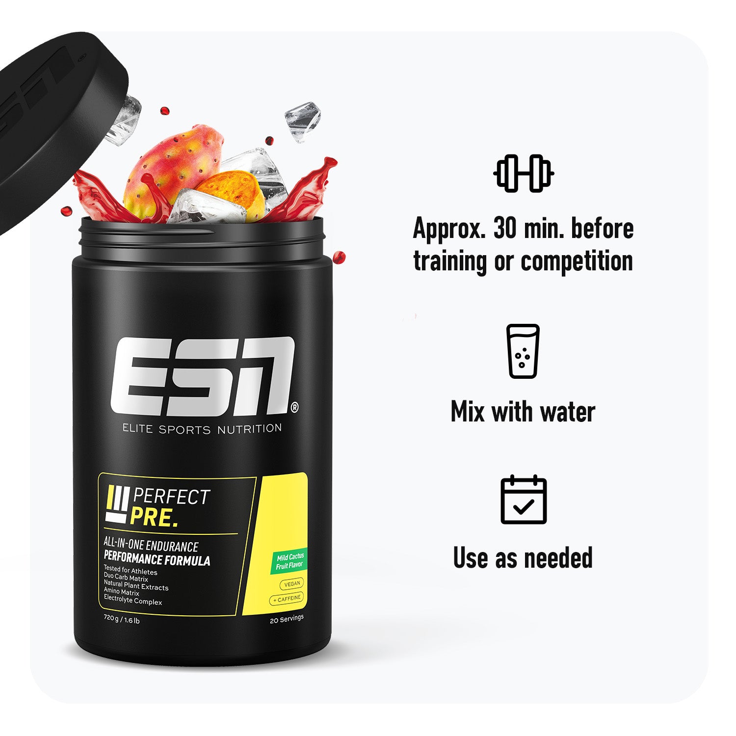 Lleve su rendimiento al siguiente nivel con Perfect Pre. La Fórmula de Rendimiento le da el impulso que necesita para conseguir nuevos mejores tiempos antes de un entrenamiento de resistencia o competición: mejor suministro de oxígeno, mejor amortiguación del lactato y suministro óptimo de energía.1,2,3